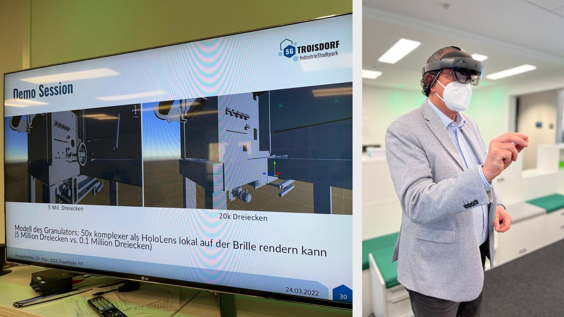 Im Rahmen des Treffens wurde aber nicht nur diskutiert, sondern auch probiert. So hatten alle Teilnehmenden z. B. die Möglichkeit bei einer Demo-Session die vom Fraunhofer FIT programmierten Anwendungen auf der AR-Brille selbst zu testen, ein 5G-SA Netz in Aktion zu sehen und darüber verschiedene Mixed Reality Remote Rendering Lösungen für hochaufgelöste 3D Modelle auszuprobieren.