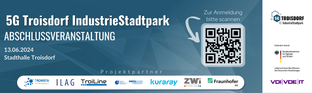 Wir laden Sie herzlich ein am Donnerstag, 13.06.2024, ab 09:00 Uhr in der Stadthalle Troisdorf (Kölner Str. 167, 53840 Troisdorf), an der Abschlussveranstaltung unseres vom Bundesministerium für Digitales und Verkehr (BMDV) mit 3,57 Mio. Euro geförderten Projektes "5G Troisdorf IndustrieStadtpark" teilzunehmen.